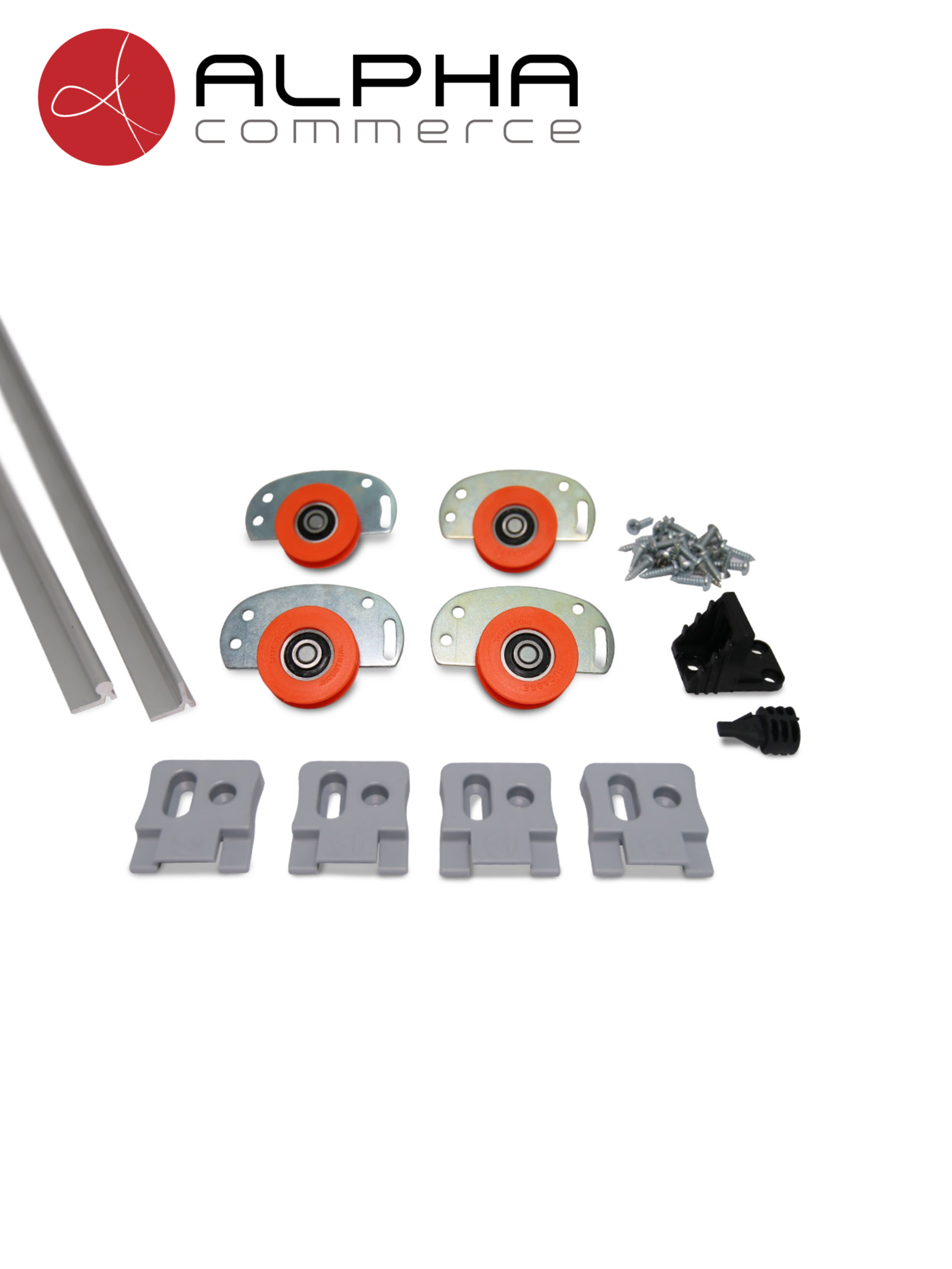 Suministro: (2) Riel de aluminio de instalación sobrepuesta inferior y (2) guías de aluminio de instalación sobrepuesta superior, terminación anodizado mate, para puertas de clóset de 15 KG hasta 50 KG.